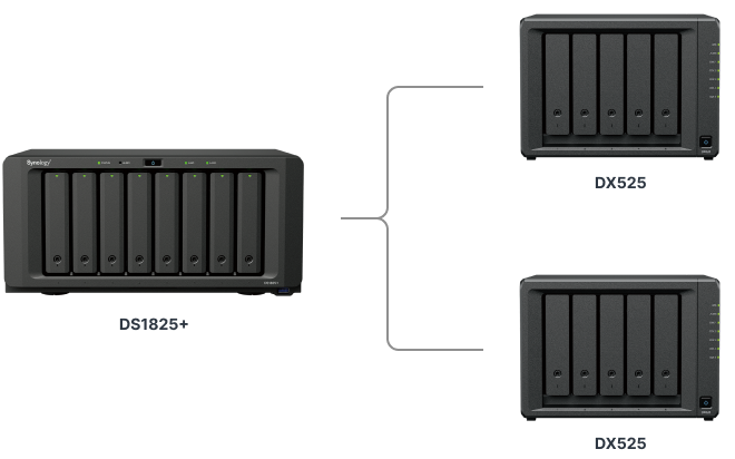 DS1825+, dahili 2.5GbE ağ desteğine sahip olup 2.5"/3.5" dahili yuvalarda hem SATA SSD'leri hem de HDD'leri, ayrıca önbellek olarak kullanılmak üzere M.2 yuvaları aracılığıyla M.2 NVMe sürücüleri destekliyor. Genişletme kartlarına desteği, 25 GbE'ye kadar daha hızlı ağ desteği sunarak yapılandırma esnekliği sağlar.